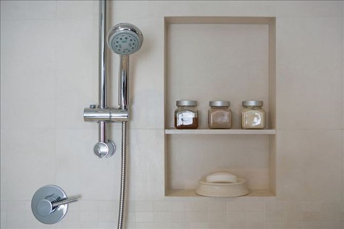 4、衛(wèi)生間一般沒(méi)有多余的空間做壁蓋,可以考慮坐下面這種的壁龕,平時(shí)放放洗浴用品什么非常方便!