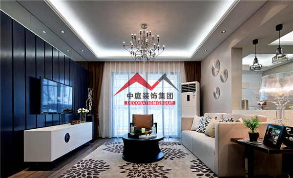 客廳主要運用灰調(diào)做主調(diào),深藍色的電視背景墻凸顯出區(qū)域感,讓整個空間充滿神秘又不失格調(diào)的優(yōu)雅。