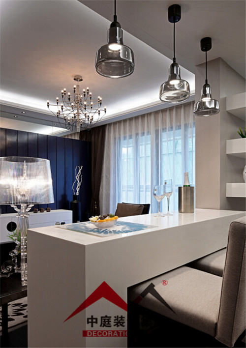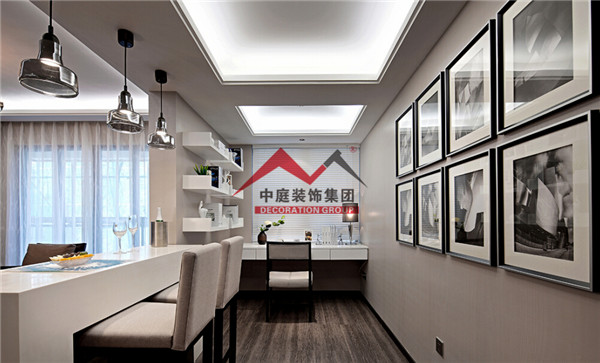 中間用一個吧臺把客廳和書房隔開,即實現(xiàn)了一個大客廳的視覺空間效果,又增加了客廳的裝飾生活情趣。