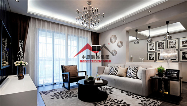 布藝沙發(fā),垂釣式吊燈,充滿設(shè)計感的小圓桌。