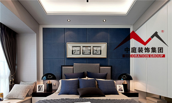床頭采用深藍色做背景墻,與床上用品的顏色相結(jié)合。