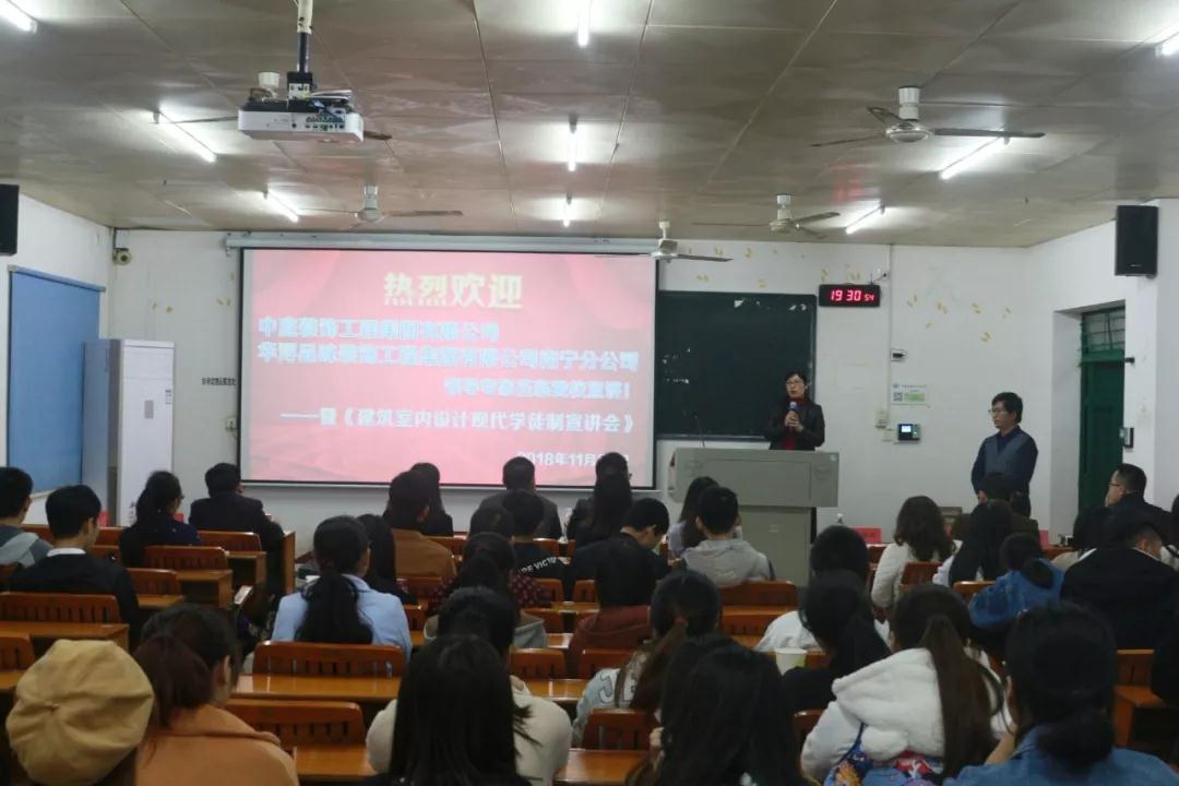 在前期的籌備活動中,已邀請過廣西農(nóng)業(yè)職業(yè)技術學院老師和學生來中庭裝飾集團進行過參觀與交流,彼此都留下非常好的印象,2018年11月22日,我公司張立安張總帶領營銷三部蘇家毅蘇經(jīng)理和人力資源部黃紅娟黃主管等人去到學院進行宣講,讓老師和學生們更加了解中庭裝飾集團,讓他們明白,選擇我們,是正確的。