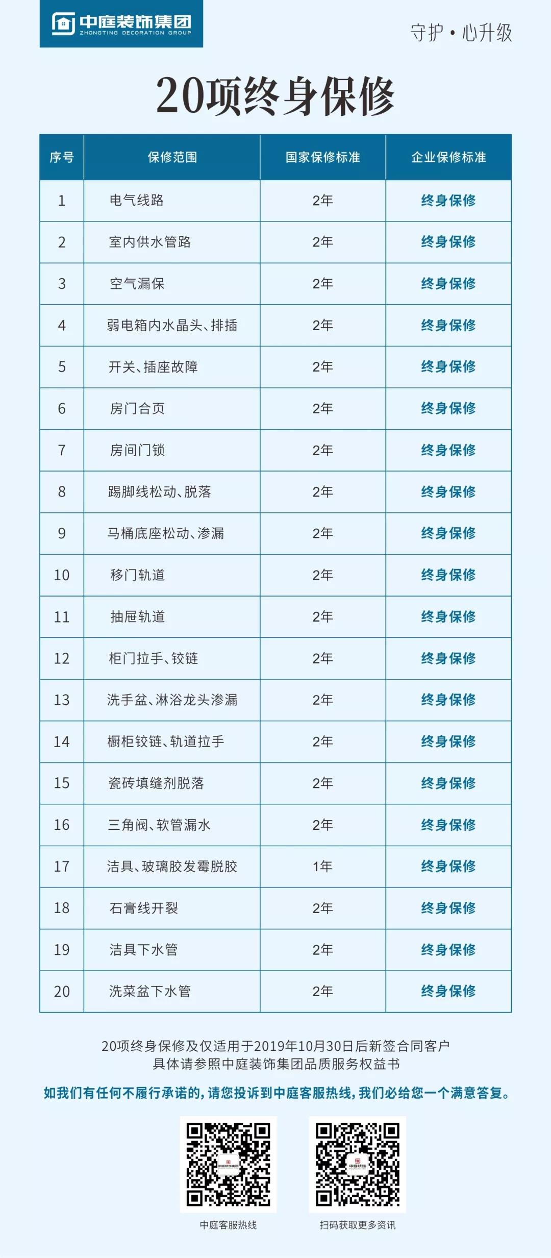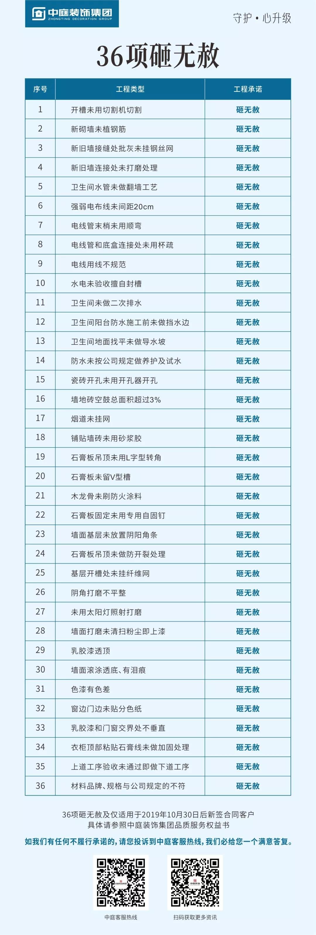 集團率先在廣西在家裝行業(yè)提出20項客戶最為關(guān)注的終身保修,以及36項砸無赦項目承諾,對于不達標的施工施行“零容忍”,以更嚴格的施工標準為品質(zhì)家保駕護航。