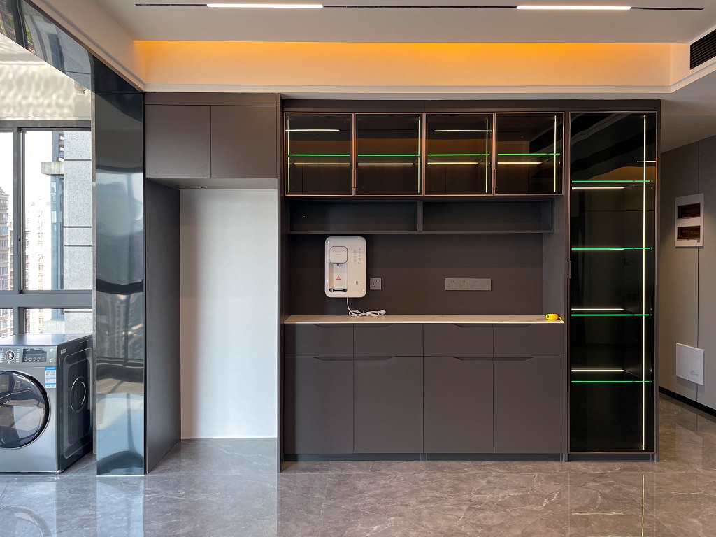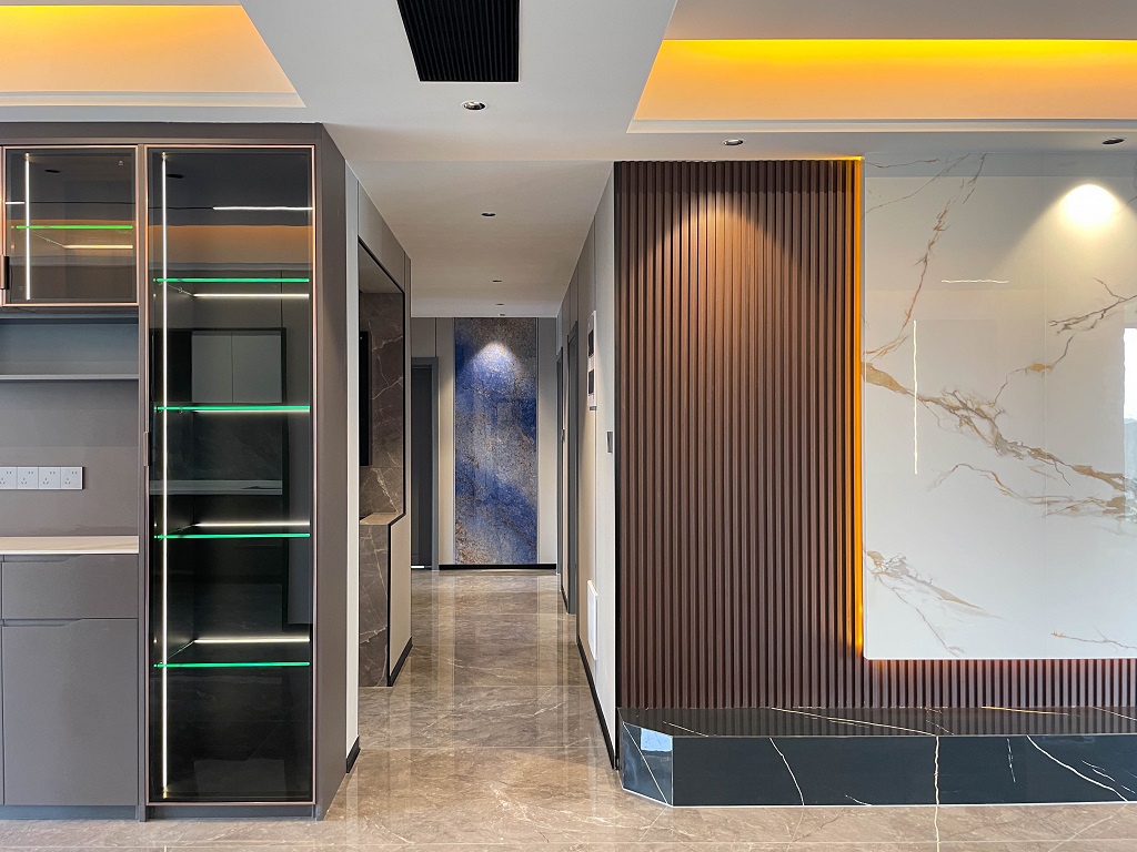 瀏覽量:441整屋采用黑色亮面護(hù)墻板,與全屋通鋪的灰色瓷磚形成和諧統(tǒng)一的整體風(fēng)格,無主燈的設(shè)計(jì),通過局部照明和燈帶的巧妙運(yùn)用,營(yíng)造出柔和的光線氛圍。雙眼皮吊頂和兩邊吊頂疊加的設(shè)計(jì),為空間增添一份獨(dú)特的層次感。