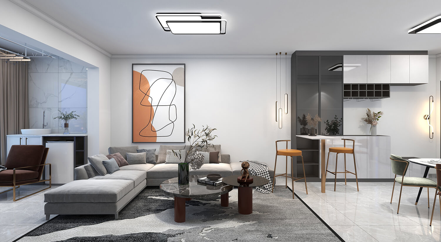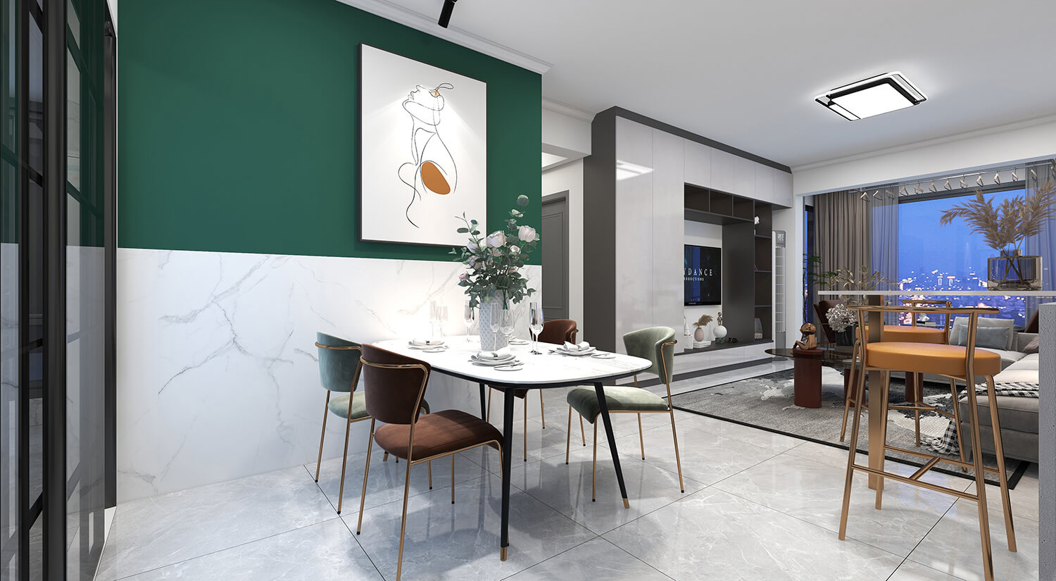 瀏覽量:315本案例戶型為:4房1廳2衛(wèi),總面積130㎡。墻壁、地板和天花板的顏色選擇明亮的白色,并搭配少量的深綠色作為點(diǎn)綴。在各種金屬質(zhì)感家具元素的襯托下,整體現(xiàn)代感十足。