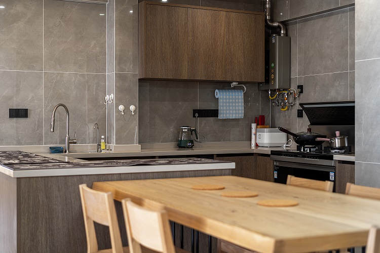 3.廚房:開(kāi)放式廚房與客廳互為連通又相對(duì)獨(dú)立,中西廚合并與島臺(tái)的設(shè)計(jì)滿足烹飪需求。